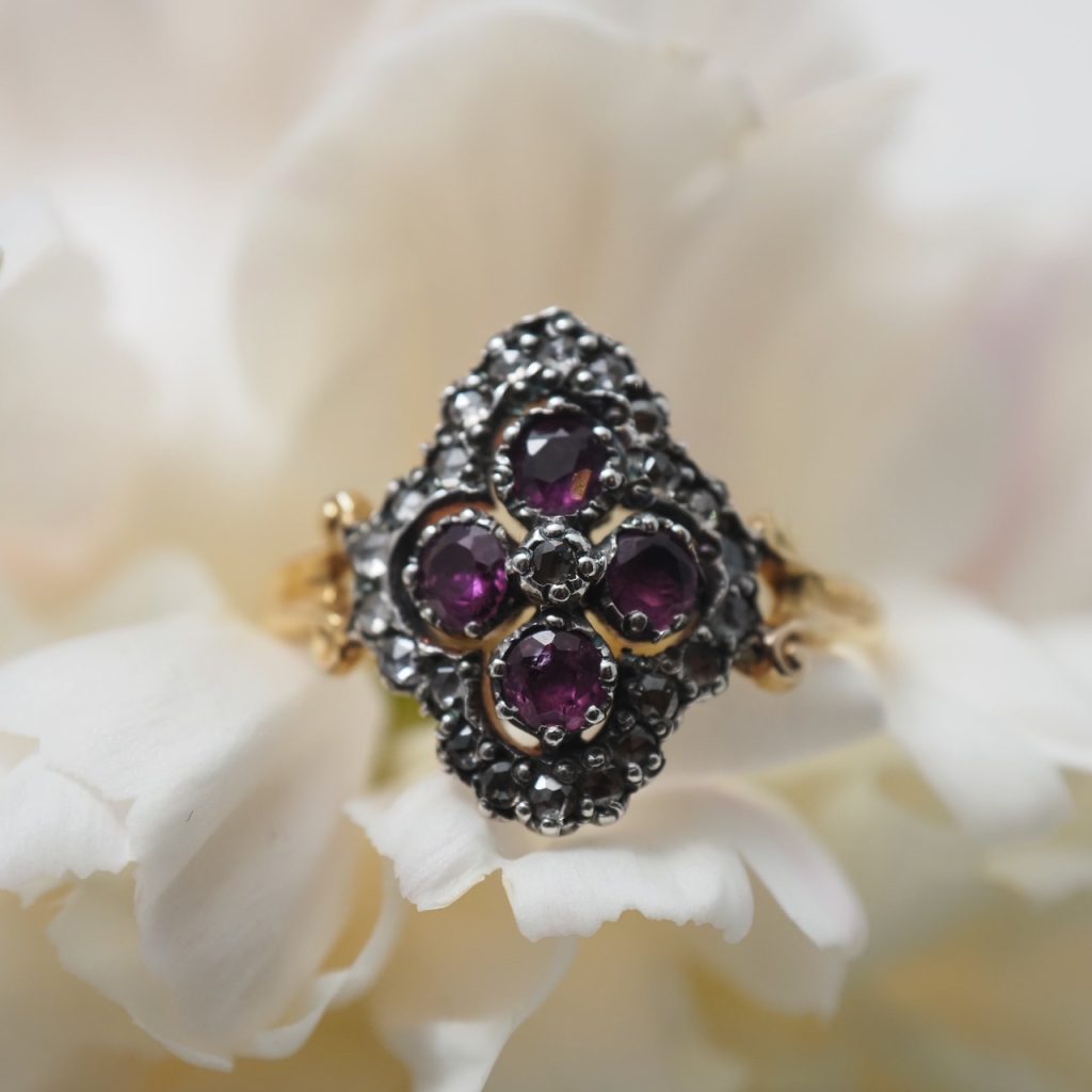 14金 天然ルビー&ローズカットダイヤモンド 四つ葉のクラスターリング