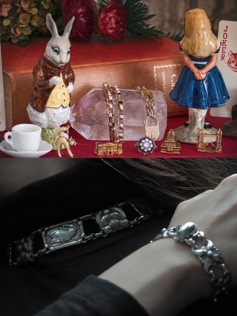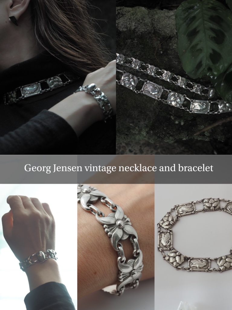 【ジョージジェンセン デンマーク ビンテージネックレスandブレスレット】とても珍しいジョージジェンセンの1950年代のアメリカに輸出用にデンマークで作られた白鳥のネックレスと、イギリスに輸出用にデンマークで作られたお花のブレスレットです。チョーカータイプのシルバーのネックレスは、優雅な白鳥とゆらめく水面のパーツと、アールヌーボーな植物のパーツが交互に組み合わされていて、首元を美しく魅せてくれます。とても珍しいクラシックデザインです。そして、ブレスレットもアールヌーボーのデザインで、1954年の刻印があります。