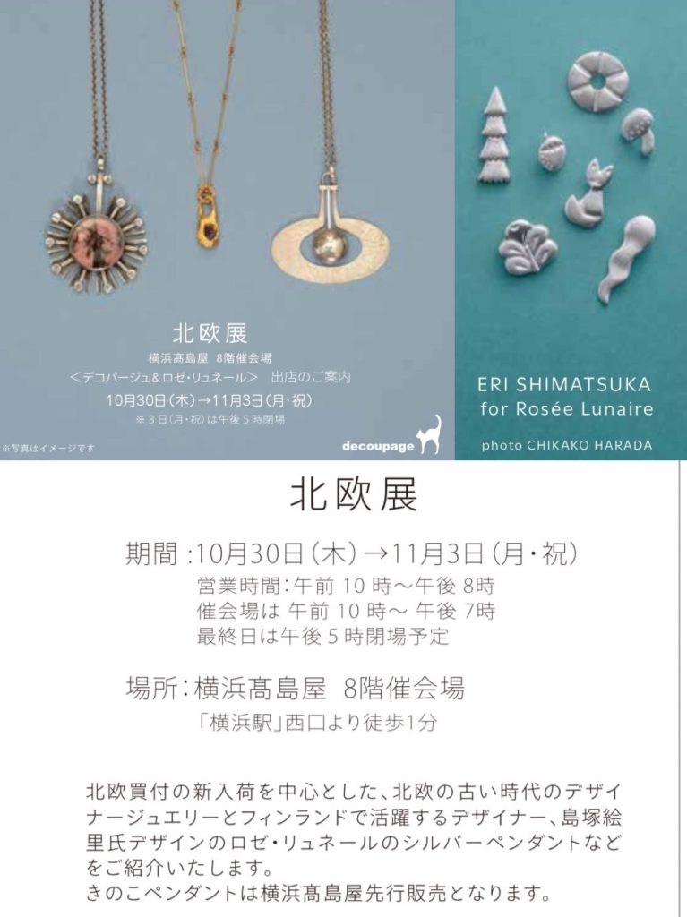初めて開催される横浜高島屋の北欧展にデコパージュとロゼ・リュネールで出店します。デコパージュからは北欧デザイナーのビンテージジュエリーを揃えて、ロゼ・リュネールからはフィンランドで活躍するアーティスト島塚絵里さんデザインのシルバーネックレスを展示販売します。7つのおまもりをテーマに数年かけて作ってきたコラボペンダントですがついに7種類完成しました!きのこのペンダントが横浜高島屋北欧展先行販売となります。
