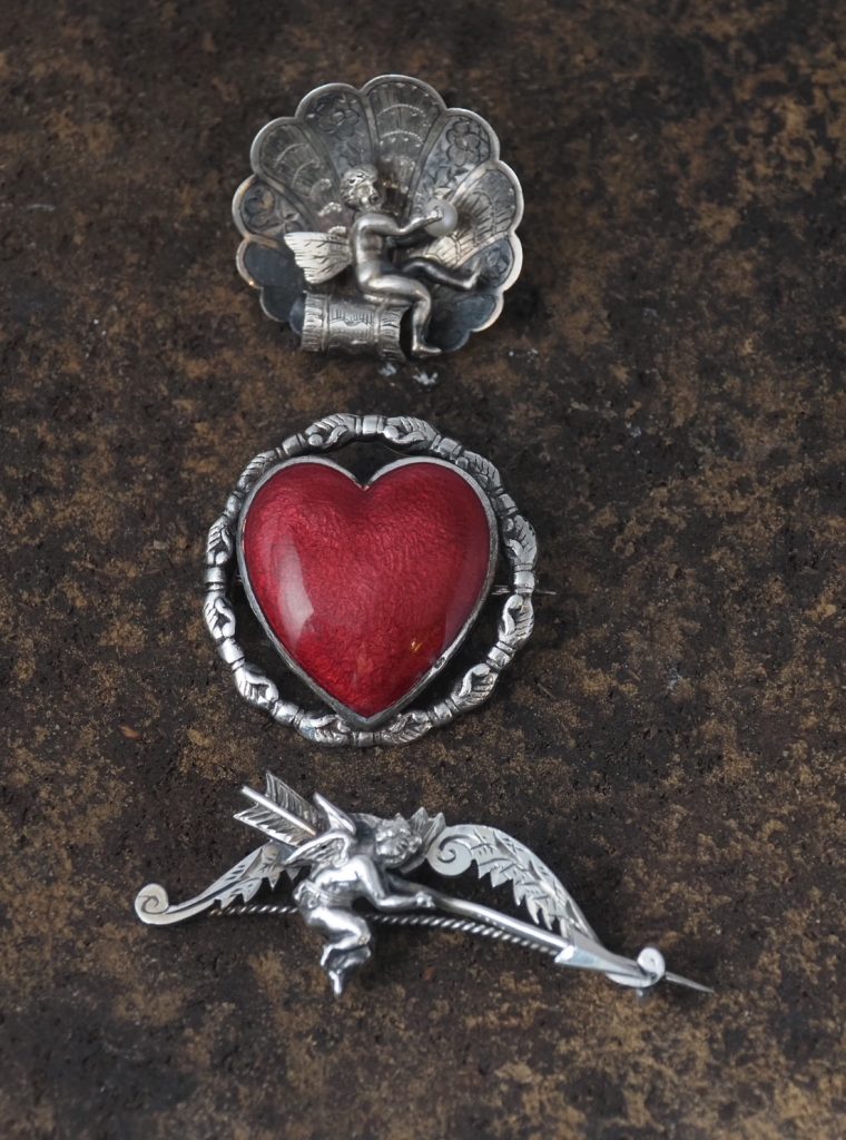 ・弓矢を持つ天使と、シェルの中で真珠を持つ天使のブローチ。