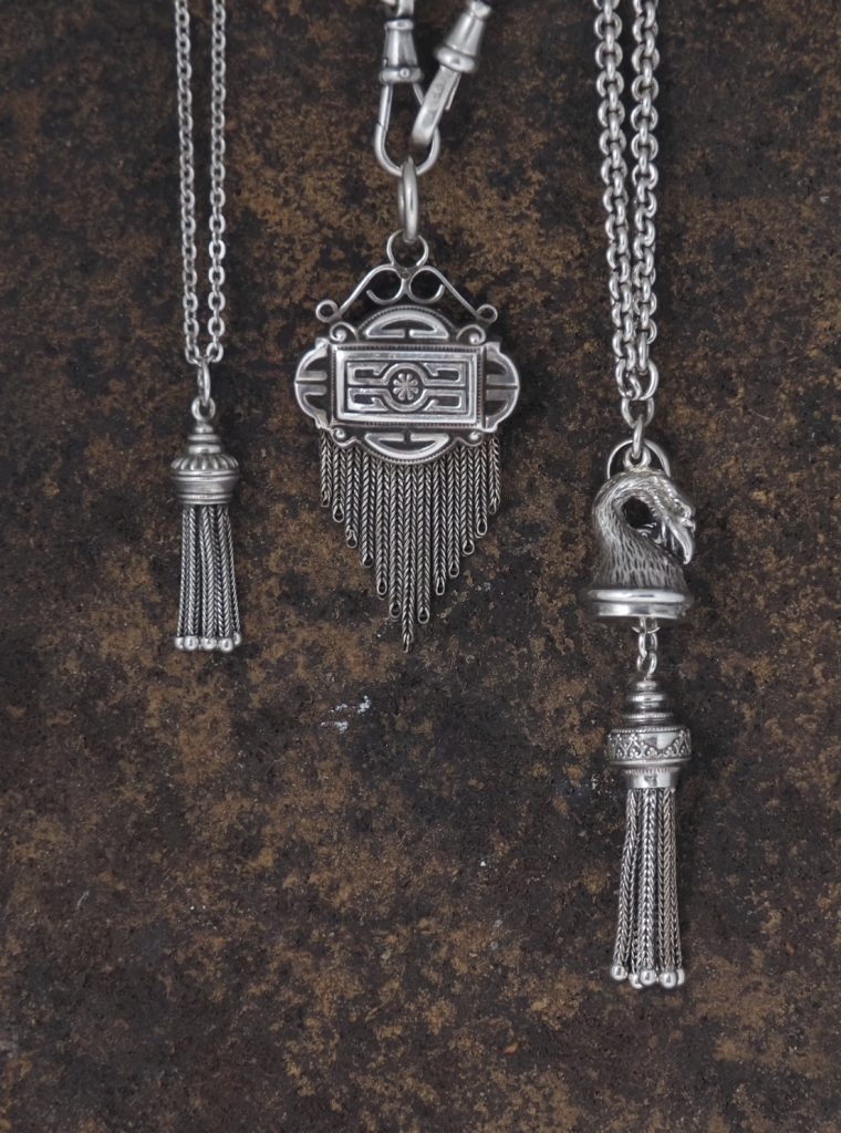 100年前の1点ものタッセル。一つとして同じデザインがないのが魅力です。ネックレスやブレスレットなど、どこにでもつけるだけで、一気にアール・デコな雰囲気になります。白鳥のシールも素敵です。