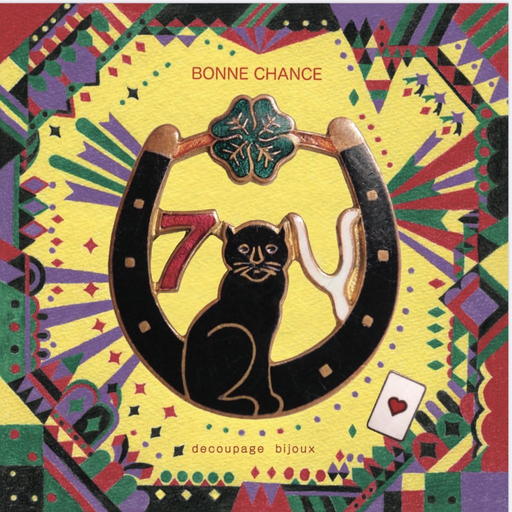 2014年のデコパージュ周年グッズとして制作した、金谷さんとのコラボステッカーがなんと見つかりました!ヴィンテージの蹄鉄や黒猫のブローチをモチーフにしたアートワークです。